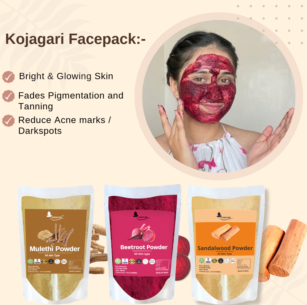 Herbal Mulethi + Beetroot + Sandalwood Powder (pack of 3) By Kojagari | Brightening, pigmentation and Tan Removal, Dtan Combo Face Pack |