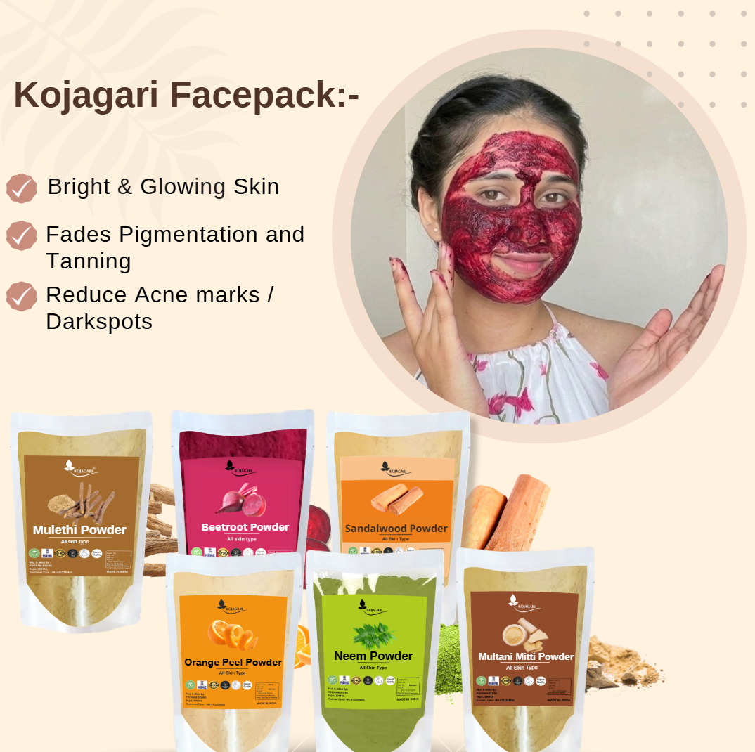 Kojagari Herbal Mulethi, Beetroot, Sandalwood, Orange Peel, Neem, Mulatni Mitti Powder (pack of 6) by Kojagari | D Tan, Pigmentation, Darkspots, Tan Removal Combo Face Pack | Brightening & Glow |